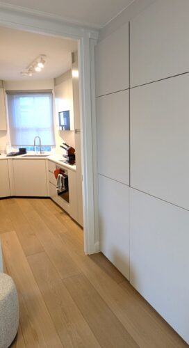 The kitchen was designed as a clean, minimalist space with refined material selection and efficient storage planning.