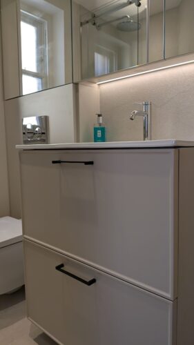 Every element was built to fit the home precisely — from the kitchen installation to the bathroom millwork, mirror cabinets and shelving.
